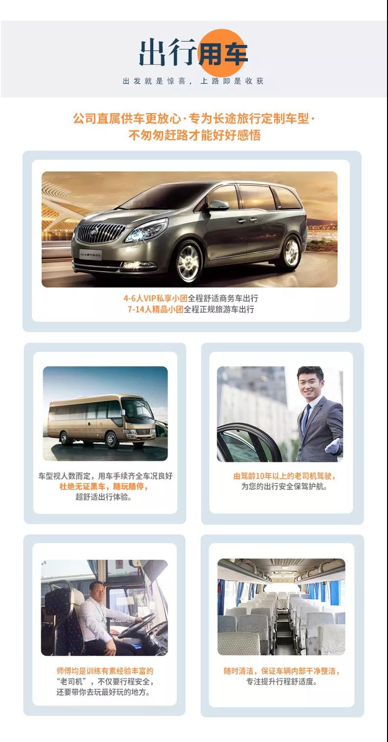 2、交通:4-6人VIP私享小團全程舒適商務車出行,7-14人精品小團全程正規旅游車出行;保證一人一正座位,車型大小根據實際人數安排,且由駕駛經驗豐富的司機為您的出行保駕護航,報價包含車費、油費、停車費、維修費及司機勞務費。