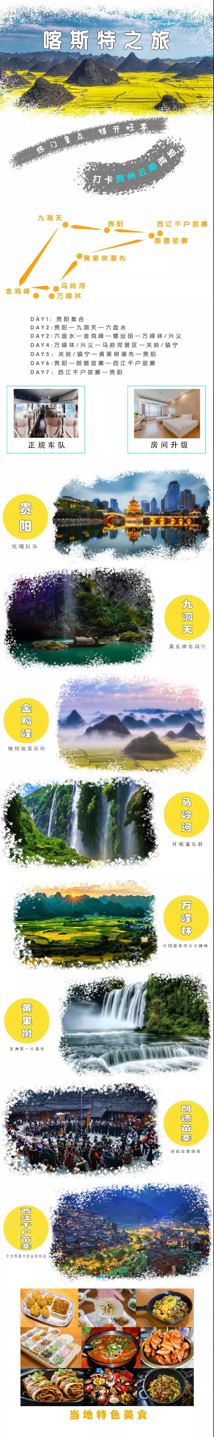 4. 門票:黃果樹門票及觀光車、西江千戶苗寨門票及觀光車、朗德門票及觀光車、馬嶺河+萬峰林門票及觀光車、小火車(不含電梯)、九洞天門票及船票;