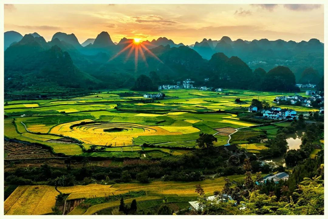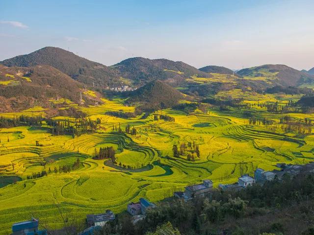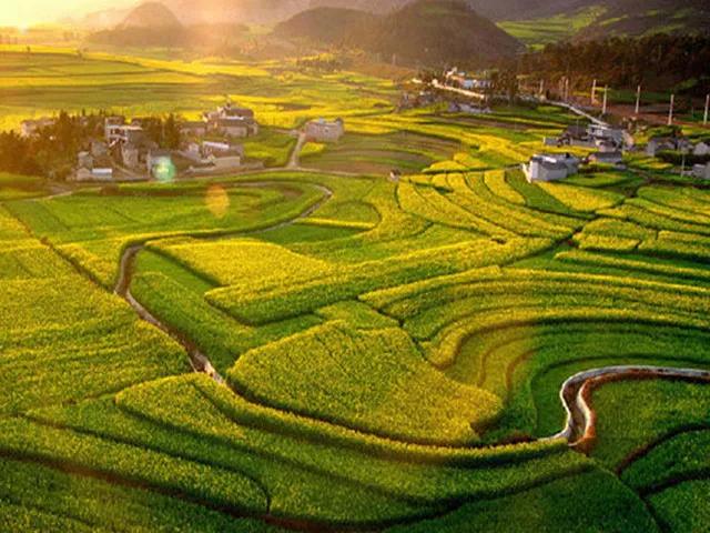 冬春季節,長滿油菜花的地塊金光燦爛,長著小麥的地塊碧綠如玉;通過時候,沿著園周梯田一圈圈往上延伸的多是開滿油菜花的,像無數金龍盤臥。還有的弓形、半園形的梯田,多的十幾級、少的三四級,而且各種形狀相鑲,其間隔有一兩塊裝滿水的閑田如明鏡置于其中,一排排翠綠的樹點綴,形成了色彩鮮明、線條優美、奇妙無比的美景。
