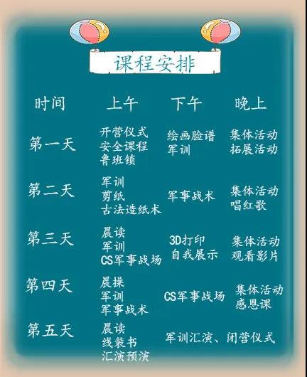 做一個(gè)屬于自己的臉譜·開啟自己的競(jìng)賽模式體驗(yàn)非遺文化剪紙藝術(shù)·享造紙之樂·觀看愛國(guó)主義電影·3D打印屬于你的傳奇·徒步探索自然·誦讀經(jīng)典·才藝表演·紙·cs真人挑戰(zhàn)·軍事對(duì)抗賽·感恩課·國(guó)學(xué)文化線裝書·草坪運(yùn)動(dòng)會(huì)·茶話會(huì)·軍事匯演及文藝展示·結(jié)營(yíng)儀式·結(jié)業(yè)證書。