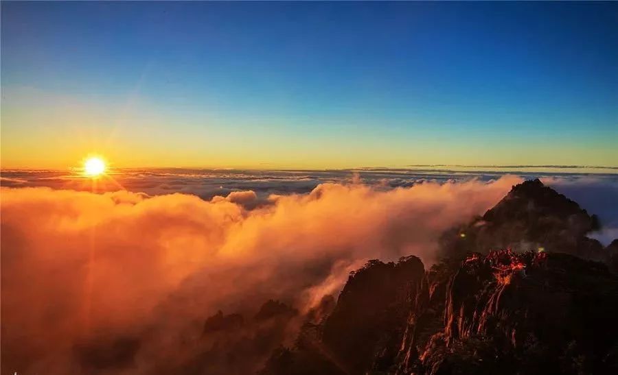 在黃山,有一種絕景,那就是日出和日落時伴跟著云海的呈現(xiàn),被稱作“霞海”或“霞鋪云”——或凝重或翻騰或縹緲的云海在霞光的映襯下,霞光萬道,照射在云海之上,色彩斑瀾,華光燦艷,涌金流銀,形成黃山奇奧的“霞鋪云”奇景。秋日,是黃山呈現(xiàn)霞鋪云概率較高的季節(jié),是以秋游黃山的人們必然要抓住機緣,若能有一次不雅鑒賞“霞鋪云”奇景的機緣,必然會使您的黃山之旅加倍難忘。