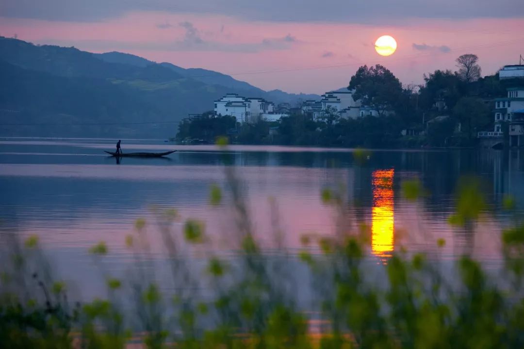 兩岸青山連綿,四周稻禾飄青,湖水環(huán)抱粉墻黛瓦的村莊,荷花盛開水蓼飄搖
