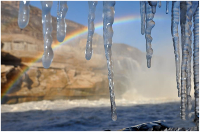 寒冬,冰封河面,瀑布失去了往日的狂奔怒號的野馬性格,變成了一座冰清玉潔的水晶宮,岸崖上,掛滿了長短不齊,粗細各異的冰凌,晶瑩剔透,玲瓏奇巧。在陽光的照射下,反著銀光。
