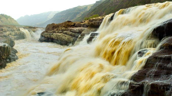 滔滔黃河,自青海源頭東流經甘肅、寧夏,在內蒙古河口鎮受呂梁山脈阻擋,轉南進入秦晉峽谷。黃河流域到此似乎厭倦了一路的平緩,突然斂水成束,一頭扎進這40米深的形似壺口的石槽中,剎那時這洶涌的急流,怒吼的洪波撞開了一幕千古奇觀。這水,勢如排山倒海,驚天動地;疾如萬馬奔騰。頃刻間,猶如天河從天而來。