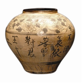 磁州窯還大量題寫詩文做器物的裝飾,這種裝飾風格最初始于唐代長沙窯,而磁州窯得到進一步的發展和完善,其書寫方法無一定規格,非常隨意。