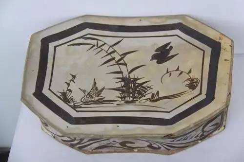 在裝飾上主要采用黑白對比的方法,其中以畫花、剔花及珍珠地最為盛行。畫花系以當地所產的花斑石為繪料,在白色的釉地上畫出黑色的花紋,其紋飾多以枝葉并茂的折枝花和生動多姿的魚間窯以獨特的創造性,一改宋代以前我國南青北白的單色裝飾方式,開創白地黑花釉下彩繪陶瓷制品的裝飾先河。