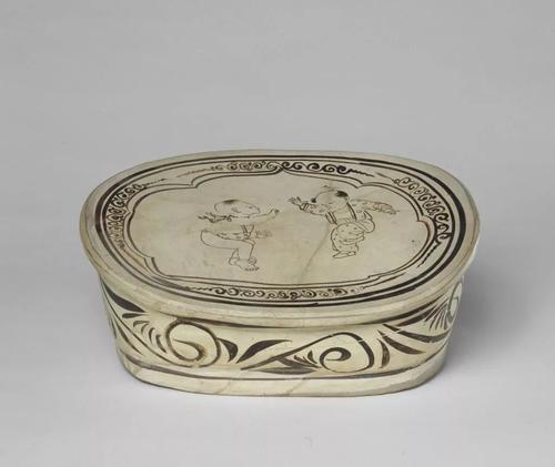 描述:枕呈腰圓形,枕面前低后高。白釉,枕面及枕側以黑彩繪嬰戲紋。枕面外周以雙線勾勒如意形開光及雙弦紋,開光與弦紋間飾四組卷枝紋。枕側繪簡單的花草紋。枕面主題紋飾畫筆簡練,描寫兩個嬰孩玩耍,其中一孩兒頭上落一只小鳥,孩兒驚愕不已,另一孩兒作興奮狀,欲上前捕捉小鳥。