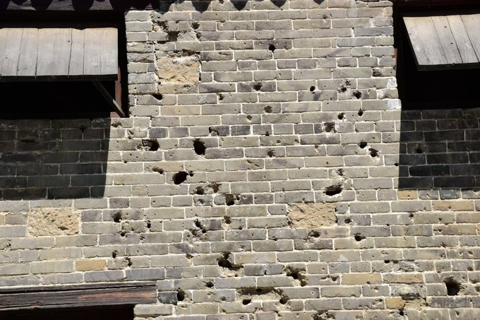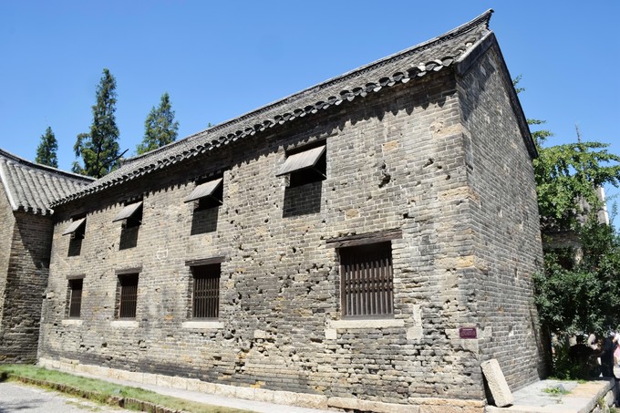 臺兒莊大戰遺址公園,位于臺兒莊古城較熱鬧地段,遺址公園內保存有幾座臺兒莊大戰時的老宅,老宅墻壁上的累累彈孔默默訴說著當年戰爭的殘酷性,也是講述臺兒莊大戰及緬懷中華民族一寸山河一寸血不屈的抗戰精神的圣地所在。臺兒莊大戰遺址公園也是各旅行團游覽的第一站,因此,此地為臺兒莊古城景區內人氣最旺的景點所在,我想這也是為了緬懷革命志士,宣傳臺兒莊不屈不撓的抗戰精神。