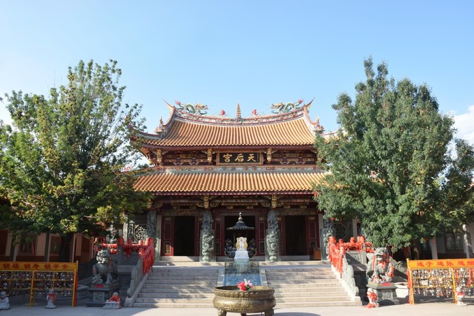 天后宮,為一處閩南風格的建筑群,始建于清雍正年間,咸豐年間重修,1938年毀于臺兒莊大戰,2010年原址復建。天后宮廣場的舞獅表演為臺兒莊古城景區內人氣比較旺的表演項目之一。