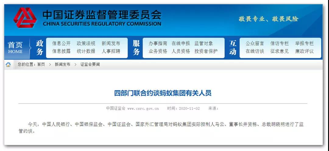 11月2日,中國人民銀行、中國銀保監會、中國證監會、國家外匯管理局齊聚一堂,約談螞蟻金服實際控制人馬云、董事長井賢棟。