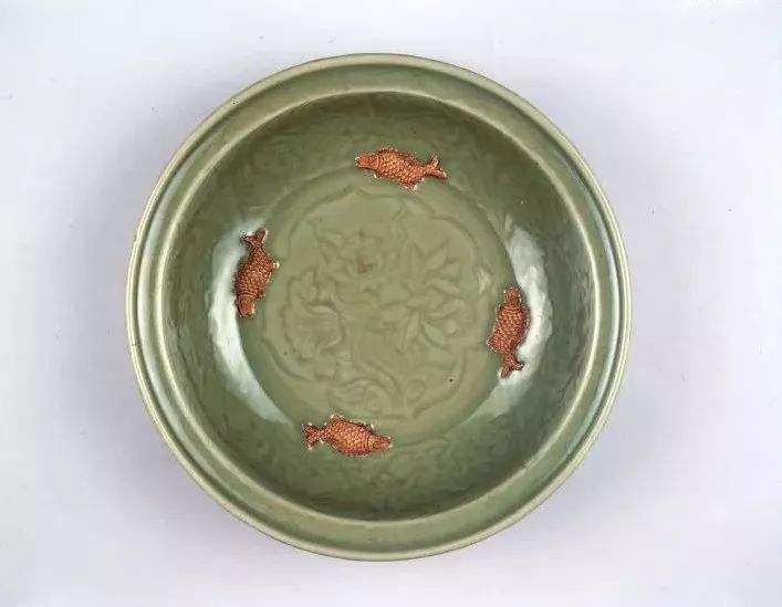 龍泉窯釉色蒼翠,北宋時多粉青色,南宋時呈蔥青色,沒有開片在器皿轉折處,往往露胎呈現(xiàn)胎色,瓷釉厚潤,裝飾上很少刻花、劃花,而流行用貼花、浮雕,例如在盤中常堆貼出雙魚圖案,在瓶身上貼出纏枝牡丹圖案。