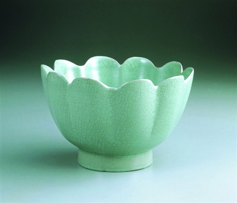 北宋時期官府在汝州設窯場,其產品稱之為“汝窯”?!叭旮G”出現的時期在越窯衰敗之后,產品主要供宮中御用,御揀退之件,方許出賣,近尤難得。汝窯胎質細潤,多數象點燃過的香灰色。透過釉底處微微帶些粉色,不同于同時期的其他青瓷,風格獨特,呈現一種淡淡的天青色,有的稍深,有的稍淡,但離不開天青這個基本色調。汝瓷釉汁瑩潤,多豆青、粉青、月白、蔥綠等。通體有細片,底有芝麻細小支釘,是支燒的痕跡。現存故宮博物院的“汝窯弦紋尊(奩)”、洗”,是古陶瓷中罕見的珍品。