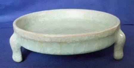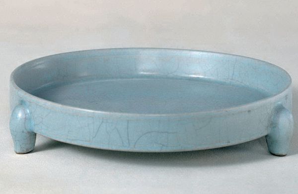 此器造型規整,釉呈淡天青色,柔和溫潤。它應與三足樽配套使用,用以承放三足樽。