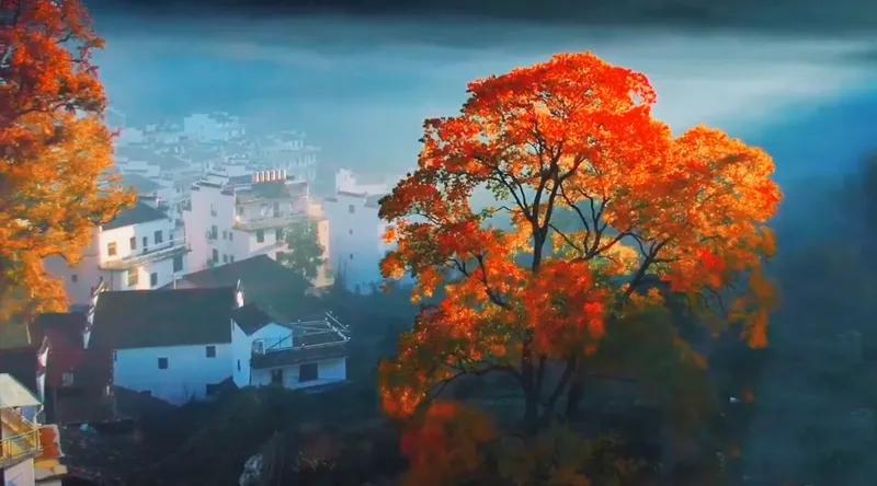 婺源的紅秋天,美哭了全世界。清晨,云霧彌漫,炊煙裊裊,在空中肆意流動變幻著各種形態,如一幅未干的水粉畫。