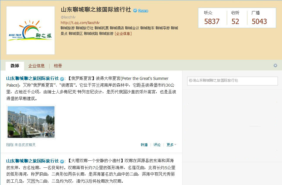 聊之旅國(guó)際旅行社騰訊官方微博:http://t.qq.com/liaozhilv聽(tīng)眾突破5000人
