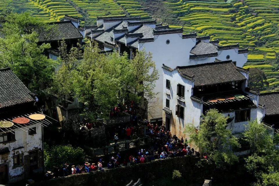 餐后赴祖源,祖源村莊始建于宋代,生態絕佳,流泉飛瀑,粉墻黛瓦,徽風古韻,村內擁有水口、古橋、古民居、古樹、思賢嶺等歷史文化景觀,尤以千年紅豆杉而聞名,有百余畝梯田景觀。
