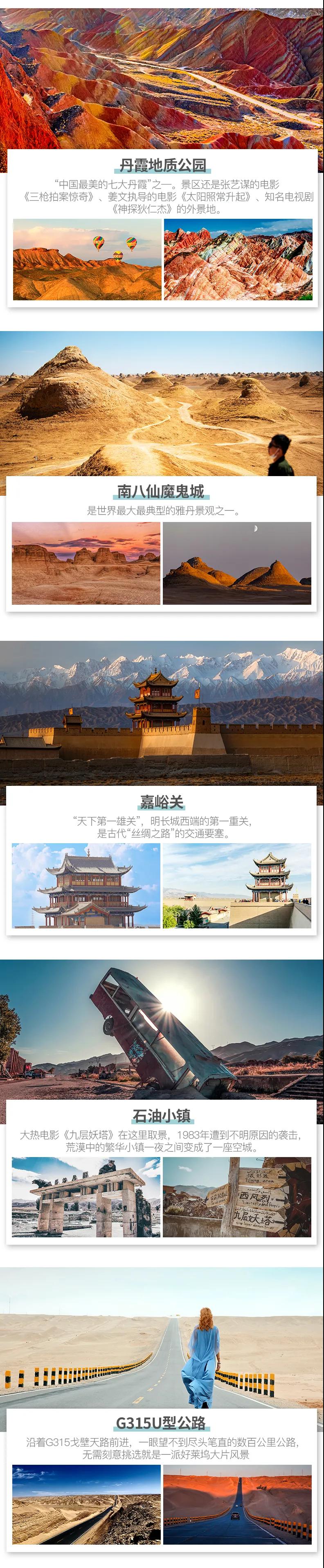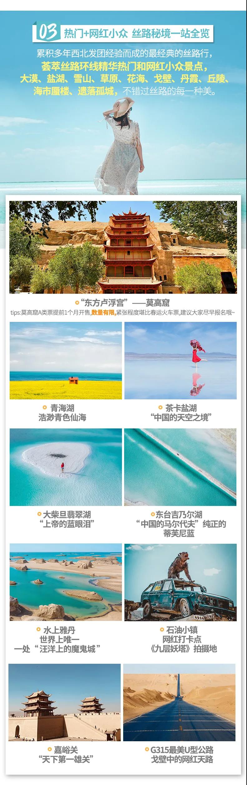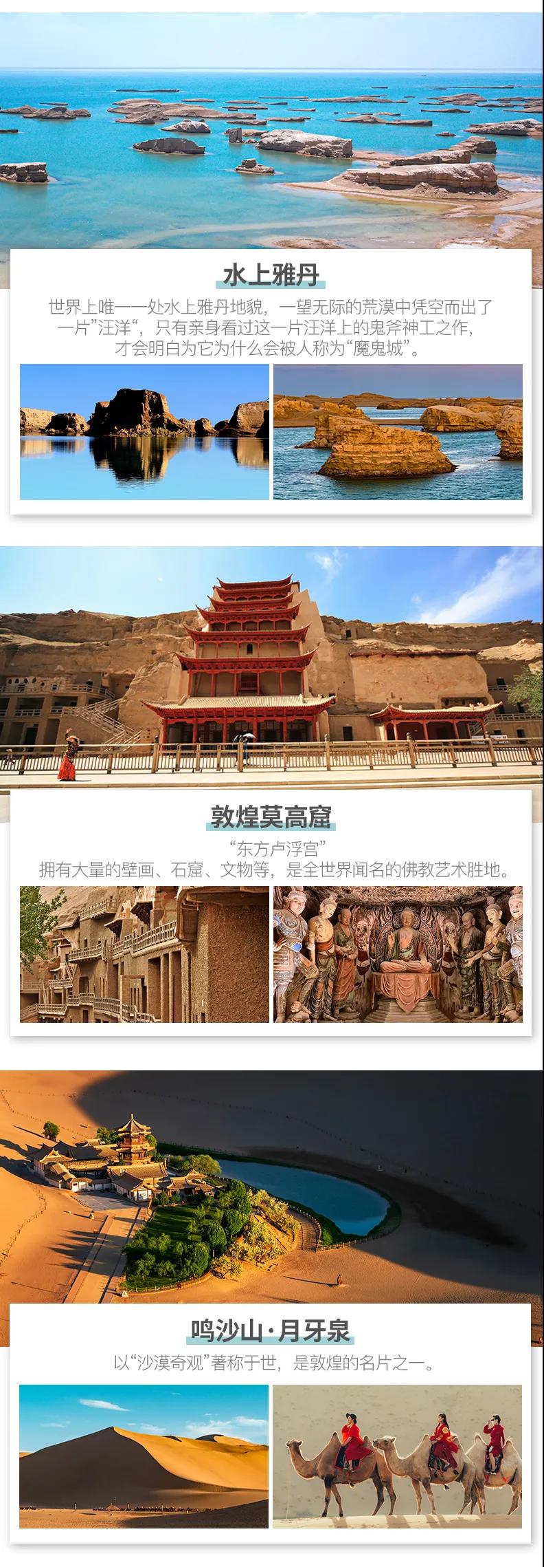 青海湖+敦煌莫高窟+茶卡鹽湖+東臺吉乃爾湖+九層妖塔+祁連草原+嘉峪關+南八仙魔鬼城+大柴旦翡翠湖+鳴沙山月牙泉+水上雅丹+張掖丹霞+G315U形公路+崗什卡雪峰