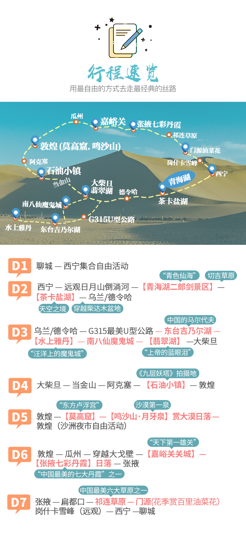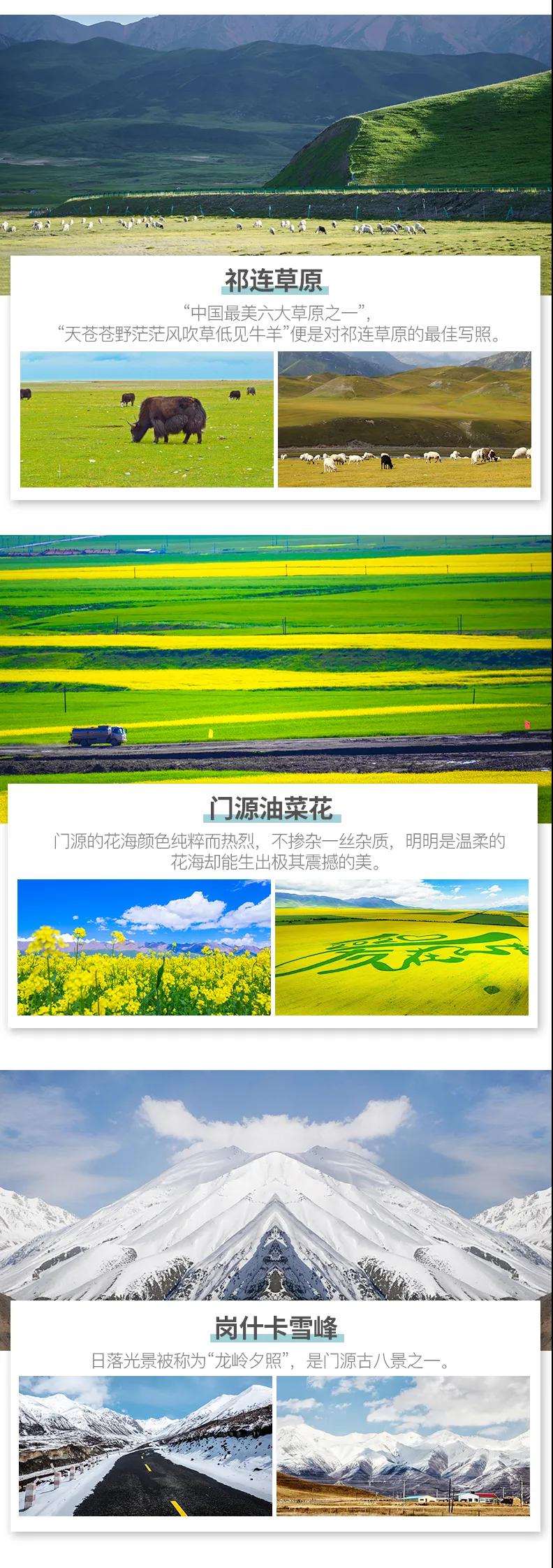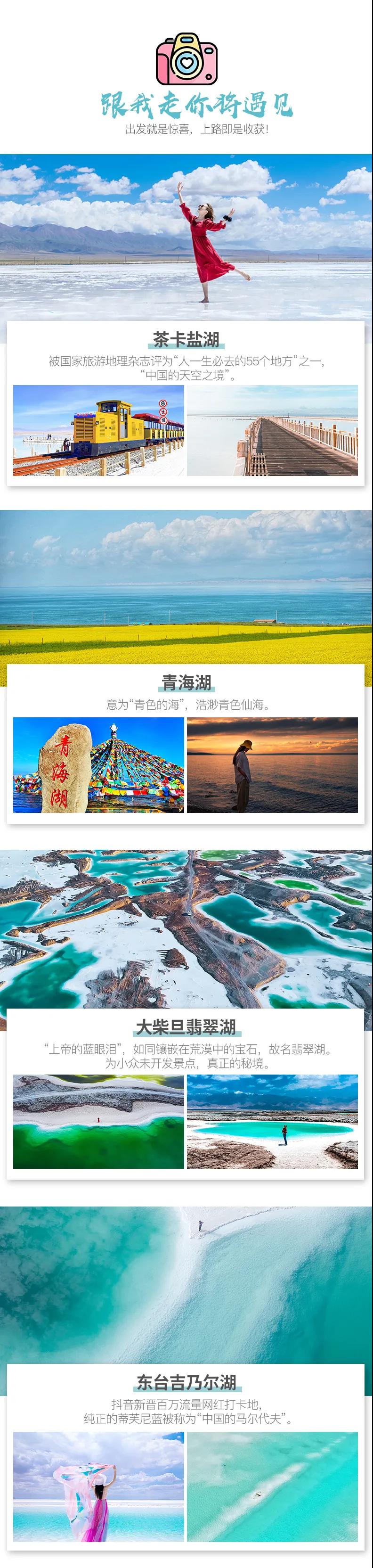 青海湖+敦煌莫高窟+茶卡鹽湖+東臺吉乃爾湖+九層妖塔+祁連草原+嘉峪關+南八仙魔鬼城+大柴旦翡翠湖+鳴沙山月牙泉+水上雅丹+張掖丹霞+G315U形公路+崗什卡雪峰