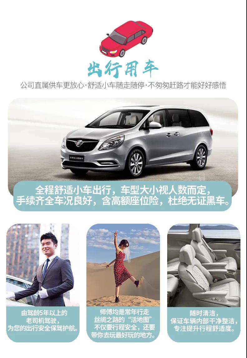 VIP私享6人小團,全程商務車出行,保證一人一正座位,車型大小根據實際人數安排,且由駕駛經驗豐富的司機為您的出行保駕護航,報價包含車費、油費、停車費、維修費及司機勞務費。