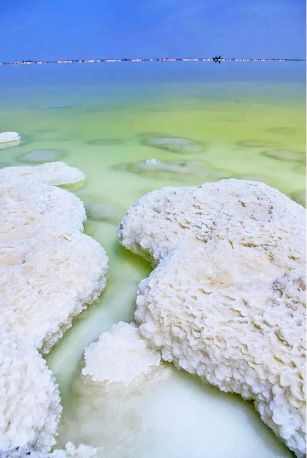因為氣候炎熱干燥,湖水的蒸發量遠遠高于降水量,湖內便形成了高濃度的鹵水,然后逐漸結晶成了鹽粒。而鹽花是鹽湖中的鹽結晶形成的特殊形狀的結晶體,由于結晶時的溫度,氣候,時間長短,濃度不同等原因,形成了各式各樣,萬千變化的美麗鹽花。生命的禁區,萬物俱寂,但是唯有“鹽花”開的最旺,它就是大自然賜給人類的絕妙作品,日夜看守這片凈土。這些鹽花無需人工的雕琢,形態各異,有的宛如貝殼,有的宛如樓臺,一叢叢,一片片,一簇簇地立于鹽湖中,把鹽湖裝飾得如仙境一般。