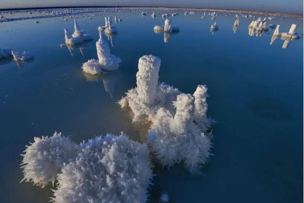 鹵水在結晶過程中因濃度不同、時間長短不一、成分差異等原因,形 成了形態各異、鬼斧神工一般的鹽花。 這里的鹽花或形如珍珠、 珊瑚,或狀若亭臺樓閣,或像飛禽走獸,一叢叢、一片片、一 簇簇地立于鹽湖中,把鹽湖裝點得美若仙境。