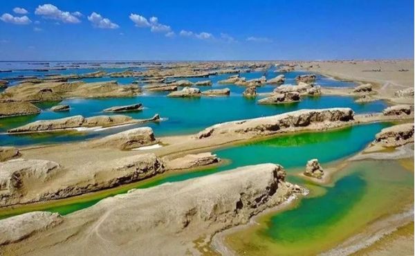 走在這里,你還可以看到鬼斧神工的“水上雅丹”,在陽光的照耀下湖水波光粼粼,同遠處的沙丘形成了一幅美麗動人的絕世畫卷,那種讓人心神搖曳的美可能無法用語言準確的描述,只有身臨其境才能真正的體驗到何謂曠世奇景。