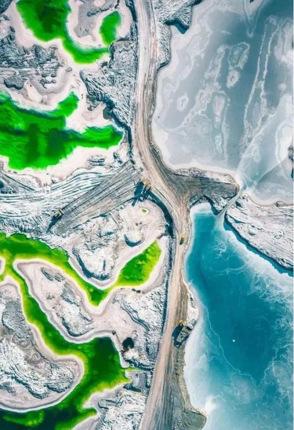 東、西臺吉乃爾湖,在一條狹長的棕黃色鹽堿土路兩側,呈現出一邊碧綠,一邊青翠,截然相反的絕美水色。