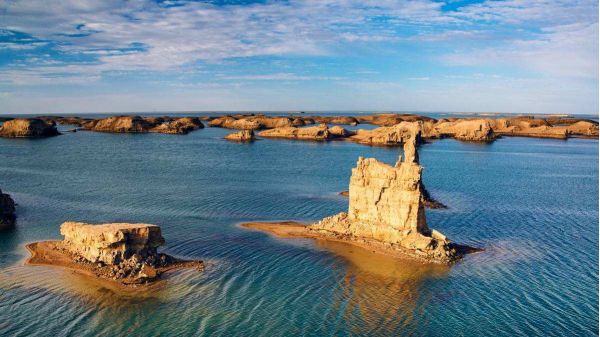 陸地的雅丹地貌很多,但是水上雅丹卻極為少有,離大柴旦240公里左右,過了東臺收費站約50公里,位于315國道旁2公里左右的鴨湖是這片特殊地貌之中的特殊,是世界上唯一一片在水上的雅丹地貌。這里還未被過度開發,這里還有著神秘面紗,你是探秘也好,你是好奇也罷,當你走進這里,你一定會愛上她。