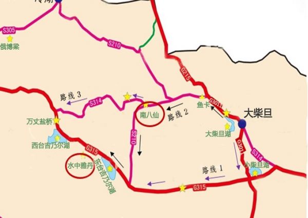 線路2:大柴旦南下高速G3011,沿“中國66號公路”之稱的315國道一直向西,沿途路過察爾汗鹽湖,這條路線路程短,車稍多,注意車速。