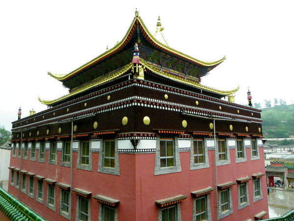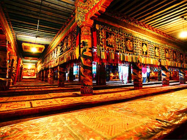 大經堂始建于明萬歷三十四年(1606),毀于火,1917年重建。土木結構,為藏式雙層平頂建筑,漢式樓閣遙相互映。經堂面闊十三間,進深十一間。面積1981平方米。堂內四壁存放著數百冊經卷。