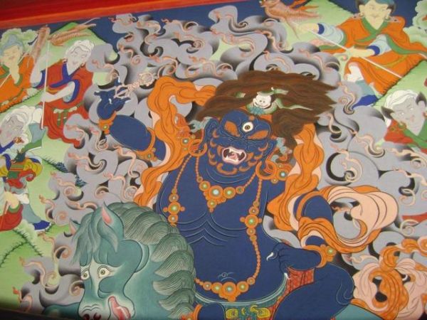 壁畫,是各個殿宇墻壁上繪畫,它大多繪于布幔上,也有的直接繪于墻壁和棟梁上。壁畫的染料采用天然石質礦物,因此具有色澤鮮艷,經久不變的特點。塔爾寺的壁畫屬喇嘛教畫派,因此具有濃厚的印、藏風味。壁畫內容,人物主次多屬密乘教義,畫面構想巧妙,布署適然,色調和諧,工藝精湛,手法細膩。