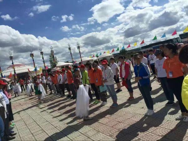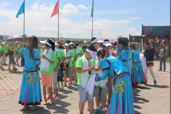 下午:來到了美麗的安固里草原,蒙古族小伙和姑娘們載歌載舞,為營員獻上潔白哈達,遞上蒙古歡迎禮節 “下馬酒”。