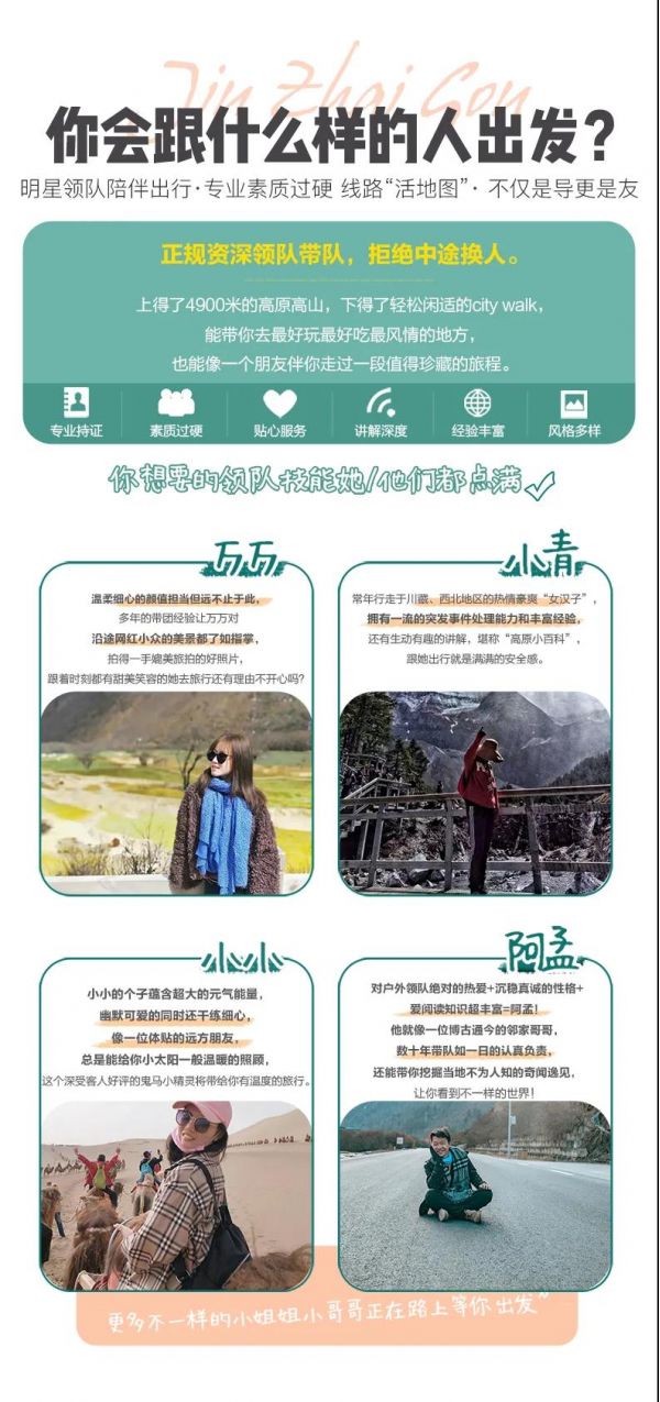 私人訂制:我們業(yè)我們客戶范圍囊括了全國各大城市,川西、西北、東北,皖南,貴州,在路上永遠(yuǎn)有我們的身影。我們將為每一個(gè)有定制需求的你策劃出獨(dú)屬于自己的完美旅行。