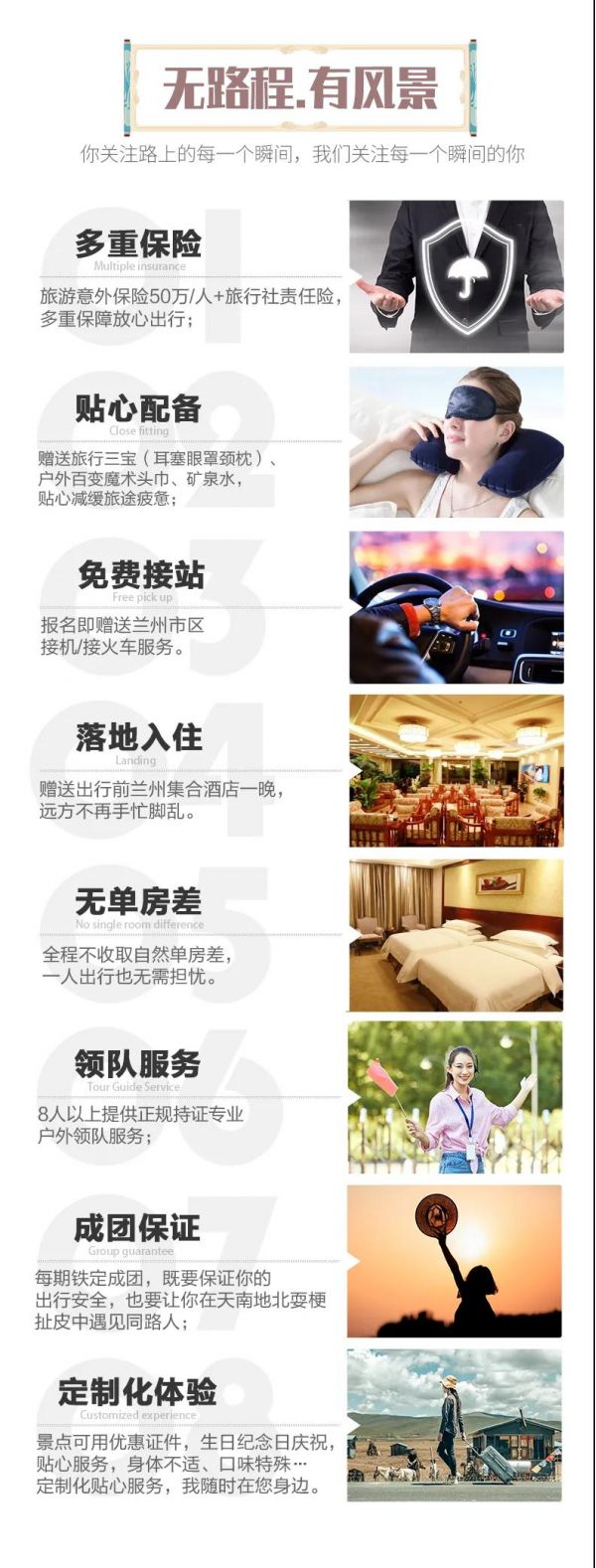 服務:8人以上提供正規持證專業戶外領隊服務;8人及以下由經驗豐富的司機提供向導服務。保險贈送旅游意外保險,旅游意外保險最高賠付50萬元/人(外賓另議),購買旅行社責任險;保險不含財產險,請游客保管好自己的財物;因旅行意外造成的客人意外傷害,按保險公司規定賠償,我方不承擔另外的賠償責任;如游客有需要可自行購買其他保障險。