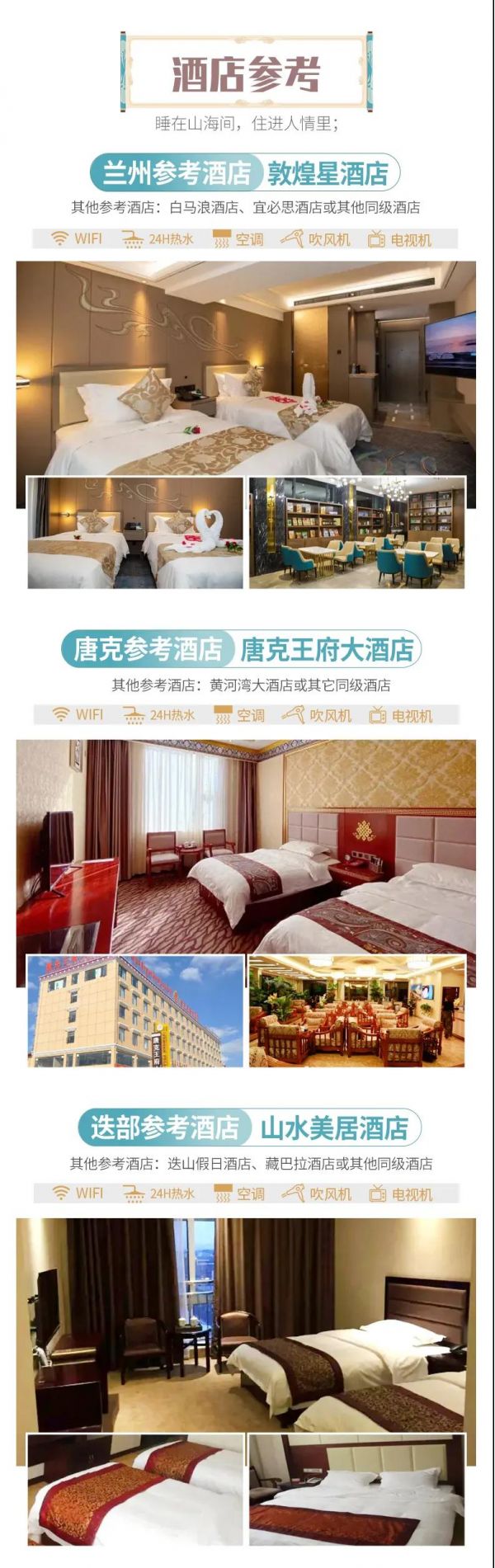 住宿:6晚當地精品酒店,確保酒店干凈衛生,溫馨舒適。因沿途高原藏區條件有限,如果酒店設施沒有達到您的期望,敬請諒解。參考酒店如下:
