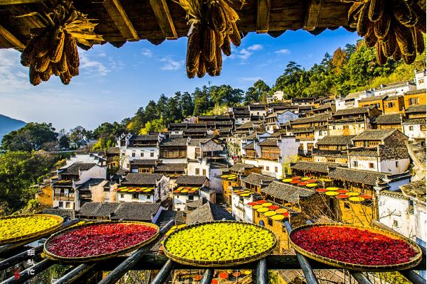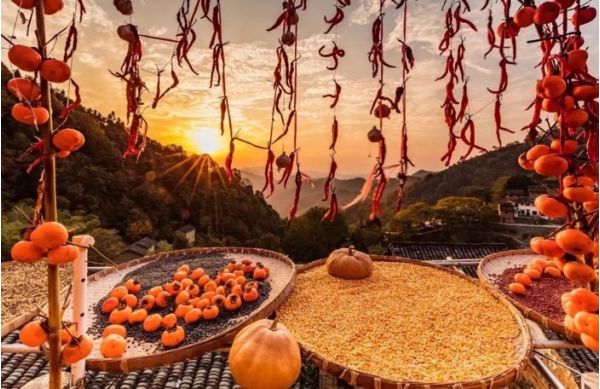 曬秋是一種典型的農俗現象,具有極強的地域特色。在湖南、廣西、安徽、江西等生活在山區的村民,由于地勢復雜,村莊平地極少,只好利用房前屋后及自家窗臺屋頂架曬、掛曬農作物,久而久之就演變成一種傳統農俗現象。