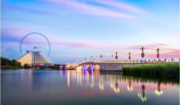 聊城地標摩天輪位于東昌湖南岸,總建筑面積約8萬平方米,地下一層,地上13層,共14層,總高130米。摩天輪直徑110米,最低點距地面20米,頂端高度可達130米,是中國唯一一座輪盤直徑110米斜拉索式的摩天輪,摩天輪共安裝吊箱42個,吊箱呈圓柱形,每個吊箱可乘坐6人,摩天輪共可攜載252人,其中多項技術與安裝工藝都是全國乃至世界首創。聊城地標摩天輪將國際學術交流中心和巨大的摩天輪融為一體,這種建筑造型在全國乃至世界范圍內都是獨一無二的,是全球首座建筑與摩天輪相結合的城市地標。游客可乘坐摩天輪登到130米高的高空,北望東昌湖,南望鳳凰湖,可一覽水城全貌。