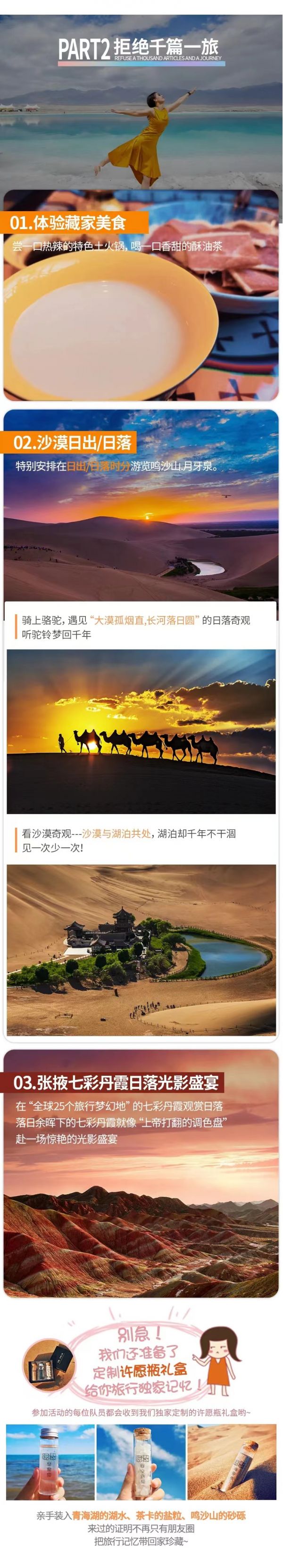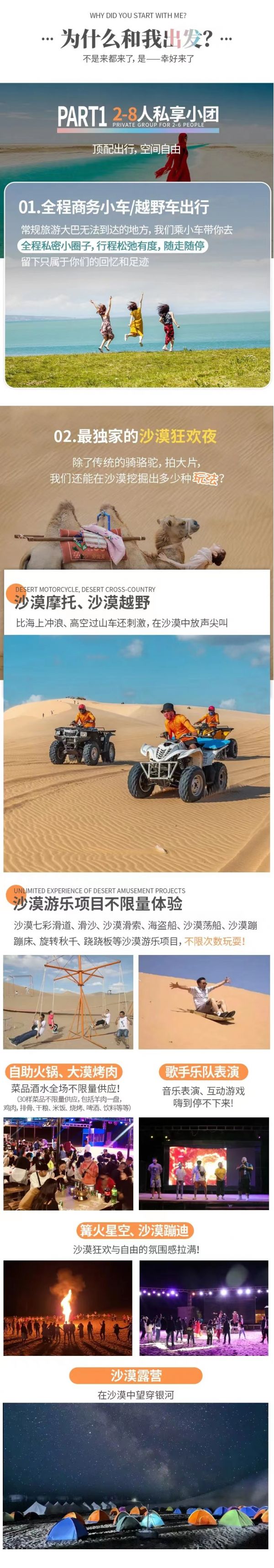 從石油小鎮出來隨后直達【敦煌】如時間充裕可參觀敦煌古城 ,最后我們抵達千年古城敦煌,有人說過,這里的風都有歷史的氣息。今晚我們特地安排了沙漠露營!沙漠露營為贈送項目,可根據自己身體狀況自行選擇。包括沙漠摩托、滑沙、土火鍋、啤酒烤肉、沙漠演唱會、煙花表演、篝火晚會、鍋莊舞,之后分發帳篷睡袋在大漠星空下露營,銀河系清晰可見任何時節只要天空晴朗都可看見流星。