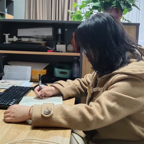 楊倚晴在完善三十個英語翻譯。