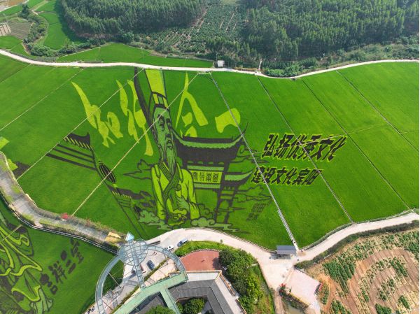 近期,大陸村稻田藝術(shù)景區(qū)迎來了一批又一批游客。站在觀景臺上俯瞰,右邊稻田藝術(shù)畫的主題是“文化賓陽”,一幅巨大的明朝思想家王陽明像映入眼簾,身后則是“賓州南街”以及“知行合一”四個大字, 展現(xiàn)了賓陽五大文化中的陽明文化與古城文化。左邊有兩幅稻田藝術(shù)畫,一幅是“如虎添翼”,一只憨萌可愛的小老虎背著一雙翅膀,寓意大陸村村民祝愿游客“凡事都能如虎添翼”;另一幅是“吉祥三寶”,畫面上是烤著串的牛魔王、拿著手機自拍的鐵扇公主和忙著給爐子添火的紅孩兒,趣味橫生,這是對“西游”文化的一種趣味解構(gòu)。