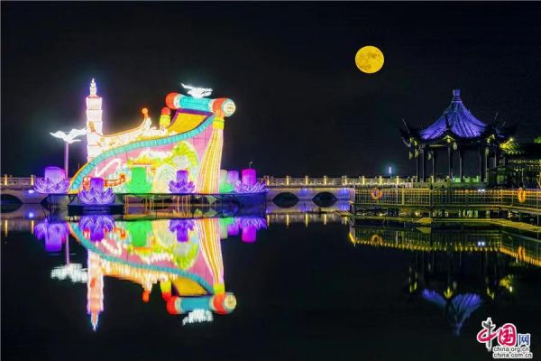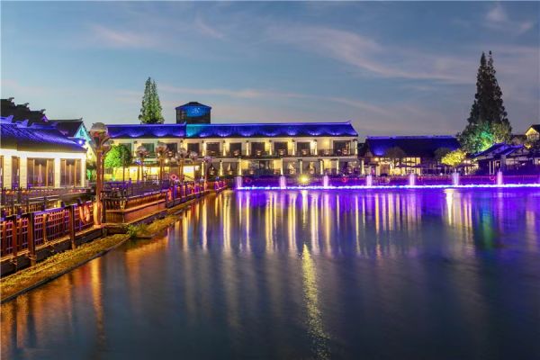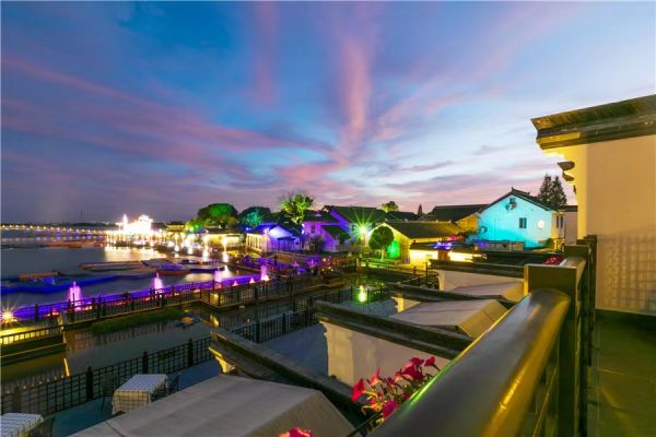 入夜時分,華燈初上,棧道旁泉流涌動,湖中心一場流光溢彩的光影秀,聲畫并茂地描繪著周莊古鎮的水鄉畫卷。