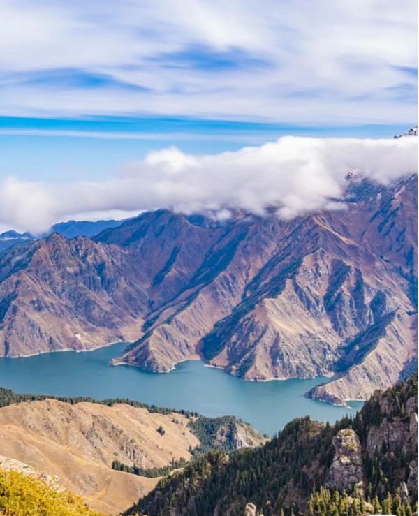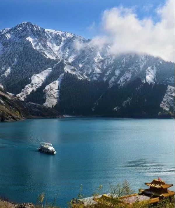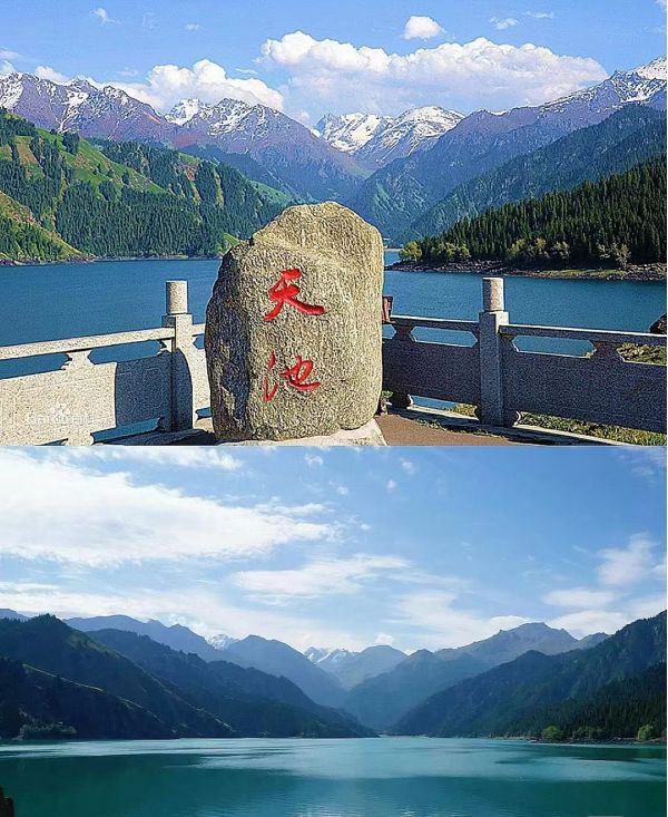 天山博格達峰海撥5445米,終年積雪,冰川延綿。天山天池是古冰川泥石流堵塞河道形成的高山堰塞湖,形狀因原來為河谷而顯得曲折幽深。