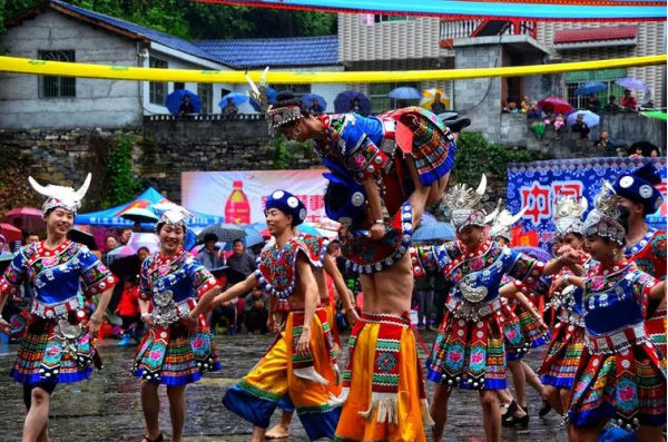 當天,苗歌“飛”天,鼓聲“震”地,馬鞍山苗寨跳花坪主會場上人山人海,熱鬧非凡?;顒釉诖笮凸奈璞硌?strong>《弦歌凱鼓頌升平》中拉開序幕。隨后,《喜慶豐收》《長城頌歌》《跳花跳月》等苗族原生態民俗節目精彩上演,涵蓋花鼓、苗舞苗歌、苗族銀飾服飾、苗族武術等,臺下掌聲連連,處處歡聲笑語。最后,苗族同胞與游客一同“跳花跳月”,演繹濃郁民族風情,共慶苗族傳統佳節。