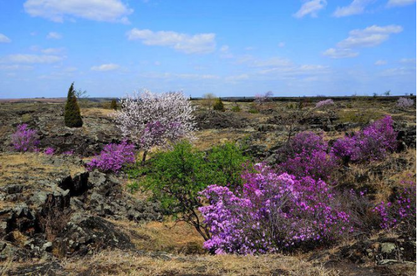 平時無人問津的暗淡闊大的熔巖臺地,在這個季節忽然就明亮起來,有了生動的顏色,它們是一叢又一叢、一大片又一大片連綿不斷的紫粉色達子香。達子香學名興安杜鵑,金達萊、映山紅也是它的名字。它們像被時間隱藏了太久,從玄武巖覆蓋的地下,從巖石的縫隙中,不管不顧地鉆出來,讓人禁不住驚嘆這蒼涼廣袤中浩蕩的明艷。沒有人知道,第一粒達子香種子是什么時候,從哪兒飄到這里,但它一定經歷過掙扎,在最初少土的巖石縫隙中奮力地扎根,極盡可能地呼吸、生長,仿佛做了一個長長的夢,就有了后來龐大、繁盛的花的群落。