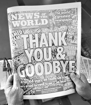 【網(wǎng)宣部】朋友隨聊之旅旅行社從英國(guó)歸來(lái),打開行李包沒(méi)見(jiàn)啥新奇古怪的玩意兒,倒是有厚厚一沓英文報(bào)紙,封面上寫著大字標(biāo)題“謝謝,再見(jiàn)”,竟然是《世界新聞報(bào)》的告別版!眾所周知,《世界新聞報(bào)》迫于“竊聽(tīng)門”事件的壓力,已正式停刊,7月10日出版的報(bào)紙是其最后一期。朋友笑道,怎么樣,我夠走運(yùn)吧,頭一回出國(guó),就碰上了收藏“終刊號(hào)”的好機(jī)會(huì)。