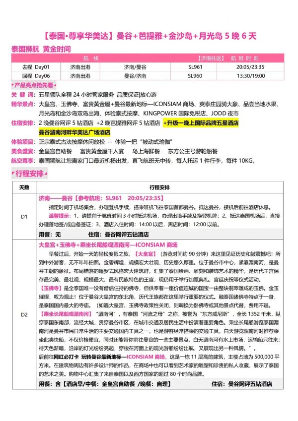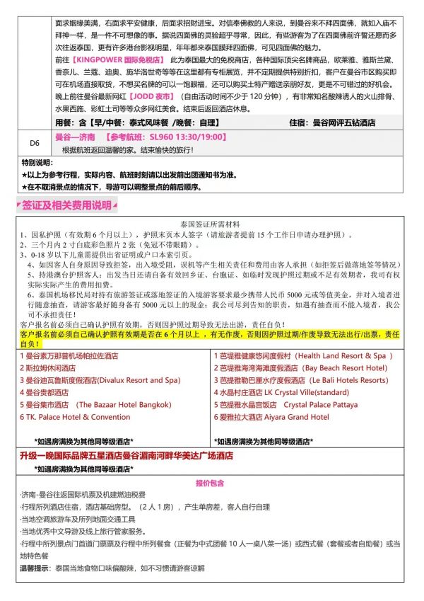 泰國6天5夜游 聊城出發 純玩 無購物 曼谷 芭提雅 珊瑚島 金沙島 ...... 發團時間 20230609 20230612 價格 2980 報名電話 0635 8681234