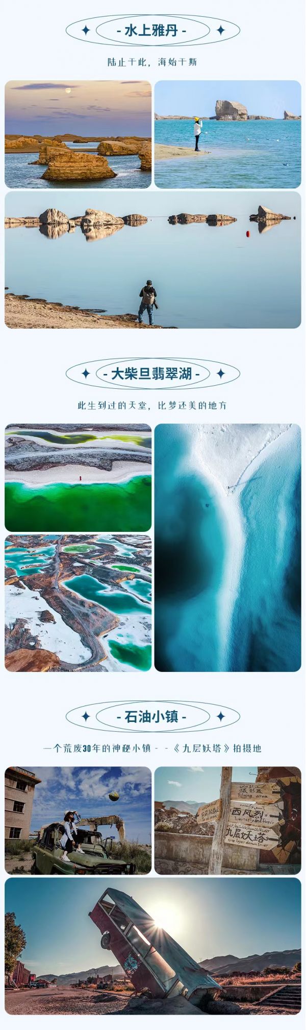 早上從大柴旦出發,來到【翡翠湖】(根據時間翡翠湖可能會調整為第三天下午游覽,翡翠湖的日落是非常漂亮的),它原本是大柴旦化工廠鹽湖采礦隊采礦區。從上俯瞰,就如一顆顆精心加工好的上好翡翠、琥珀綠松石鑲嵌在大地上,美的讓人心動。