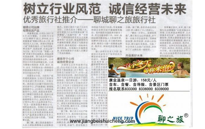 電話:0635-8333000 8336000 8339000 傳真:0635-8336665 地址:山東省聊城市東昌府區興華東路7號 郵編:252000 官方網站:www.haginoshika.com 歡迎致電全國統一(免長途)熱線:400 0635 369 國內旅游請按1 國際旅游請按2 聊城旅游請按3 票務會議租車請按4 人工請按0 版權所有:Copyright(C) 劉寶平工作室_Mr.Liu Stu 聊城市旅游攝影協會 「我們」? 商會丨俱樂部丨實業公司 山東聊城聊之旅國際旅行社有限公司