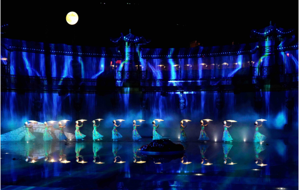 《德夯幻境》以德夯苗寨的天然山水為舞臺,以苗家婚戀、愛情、出征、奮斗、凱旋為線索展開,集苗歌、苗舞、詩情獨白于一體,打造沉浸式5D苗境喜宴劇場。整場演出嘗試了室內室外相結合的模式。室內的八個小劇場圍著中心舞臺,演出的上半部分在每個小劇場進行,主要通過話劇表現翠翠的婚姻故事,追憶湘西往事,引出宴席的由來。室外水舞臺正對著德夯大峽谷的高聳奇峰,以著名的德夯大峽谷、德夯苗寨為背景,自然的環境與光影、音樂、戲劇、公共藝術、體感交互和多終端數控技術疊加起來,營造出一個似劇非劇、似演非演、似宴非宴、似寨非寨的沉浸式體驗空間。
