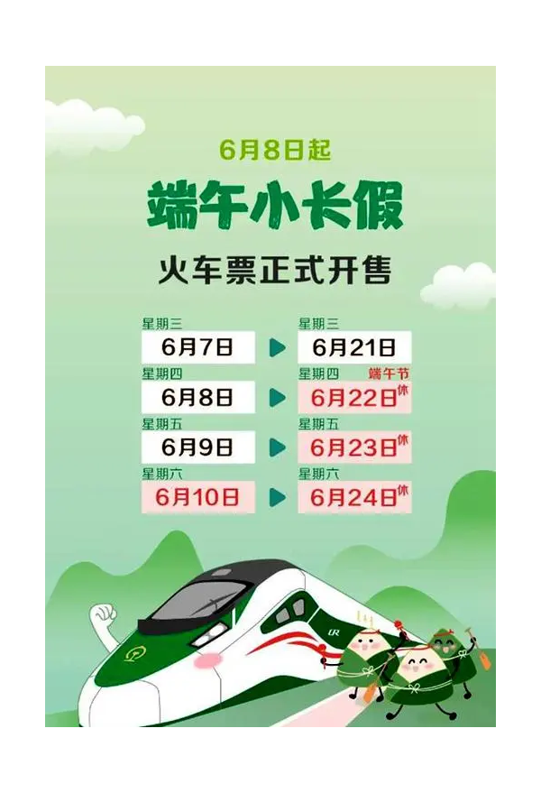 今年端午節(jié)從6月22日至24日放假調(diào)休,共3天。按照目前全國鐵路車票預售期15天的規(guī)定,6月8日起,旅客可以通過鐵路12306網(wǎng)站、鐵路12306APP購買6月22日的火車票,6月10日起,可購買6月24日的火車票。